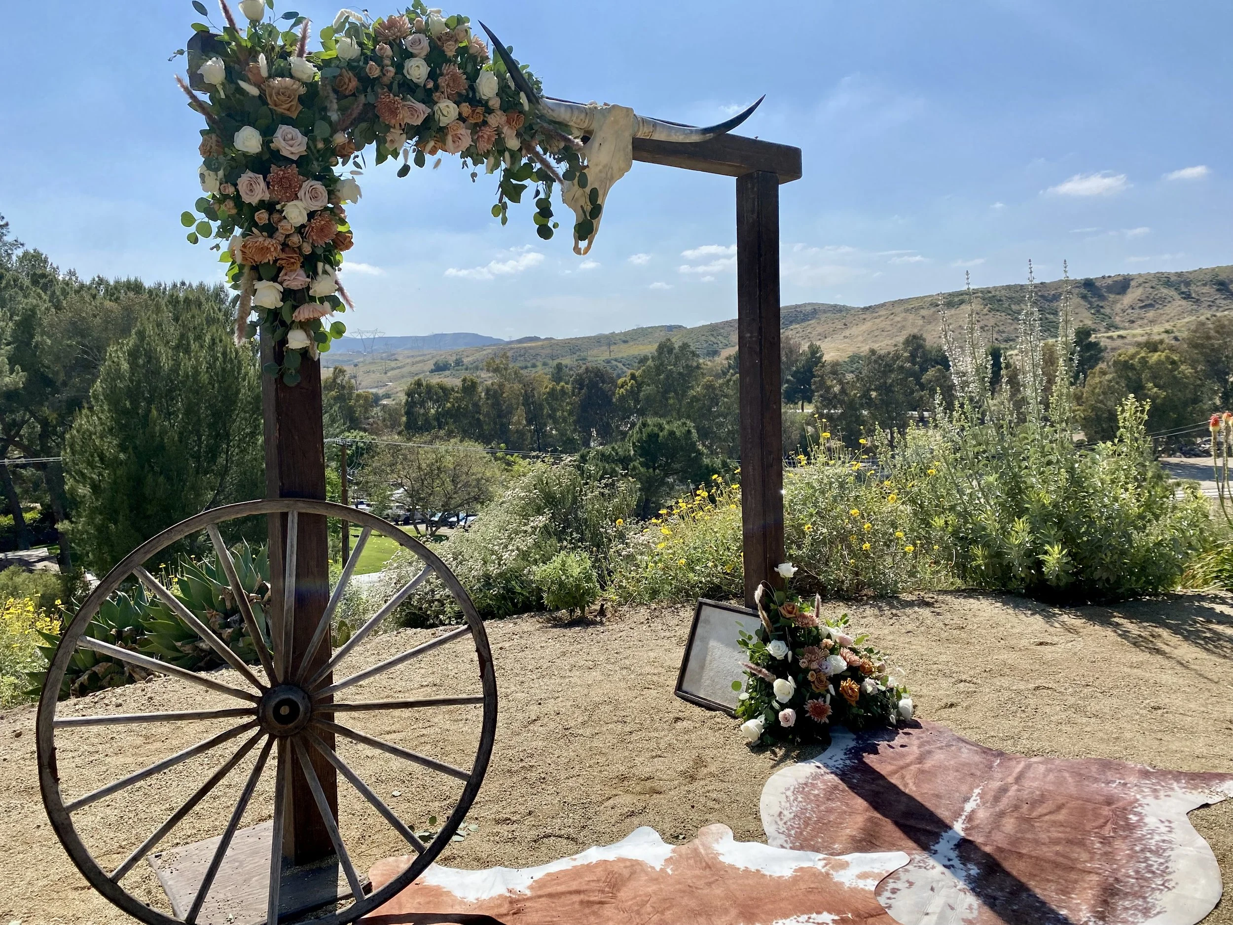 The bride is staged and brought in on a golf cart through the back of the hill side to the location. This does make for a grand entrance.